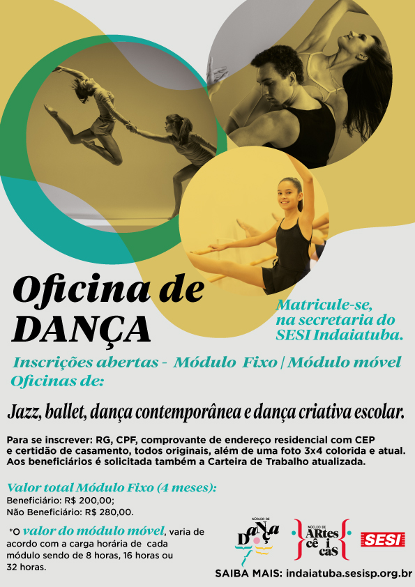 O Núcleo de Dança do SESI Indaiatuba, está com inscrições abertas para os módulos móveis e fixos de JAZZ, jazz, ballet, dança contemporânea e dança criativa escolar, matricule-se na Secretarias do SESI Indaiatuba.
