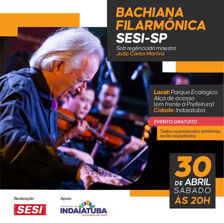Sob a regência do mundialmente conhecido maestro João Carlos Martins, a Bachiana Filarmônica SESI-SP se apresenta no dia 30 de abril, às 20h, no Parque Ecológico, na alça de acesso em frente à Prefeitura de Indaiatuba. A orquestra trará um repertório clássico, que promete emocionar o público. A apresentação é gratuita.